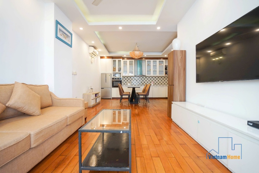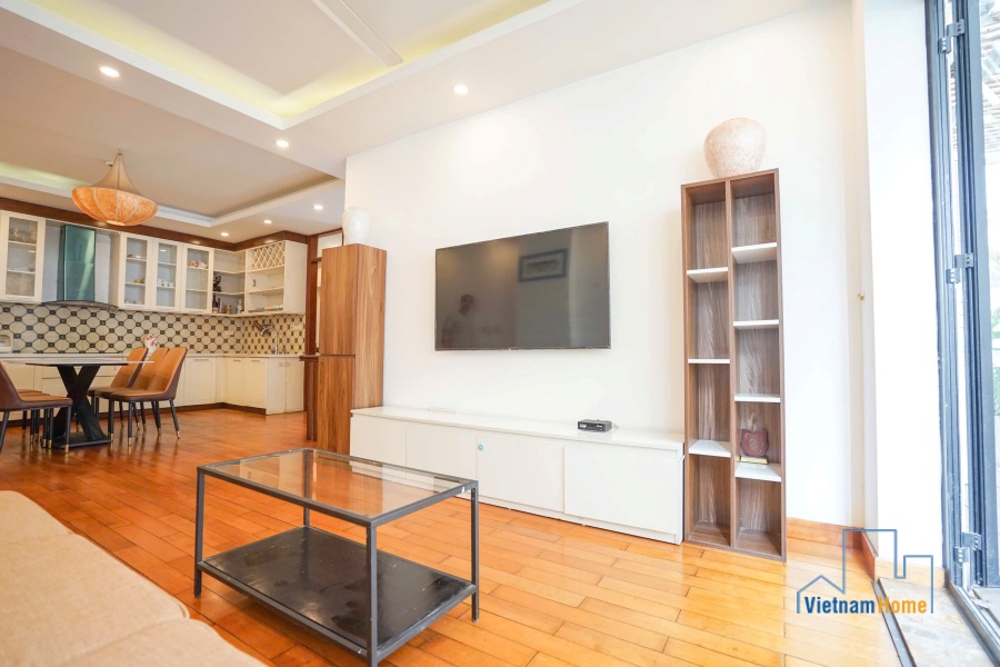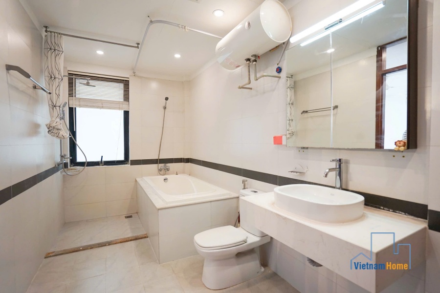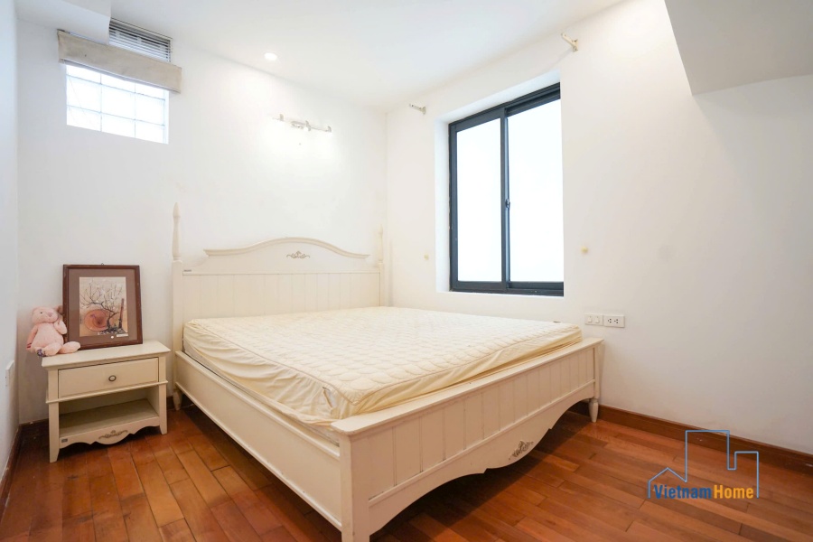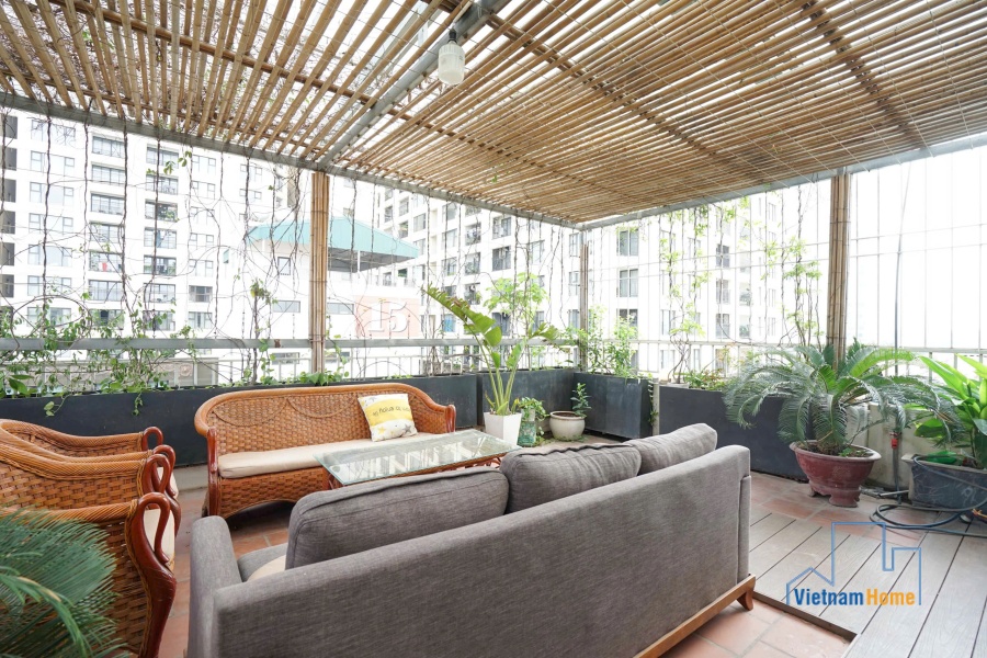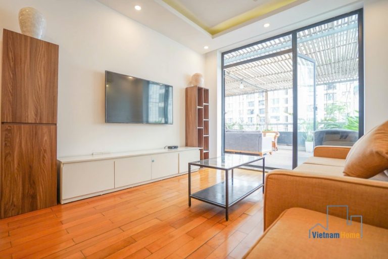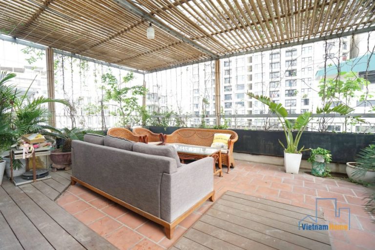 This penthouse apartment is located in one of the most best location in Tay Ho, Hanoi. There are 1 living room, 3 bedrooms, 1 open kitchen and 2 WCs. Specially you can enjoy over city view from the terrace on the rooftop, it looks like a mini garden with many trees and flowers.